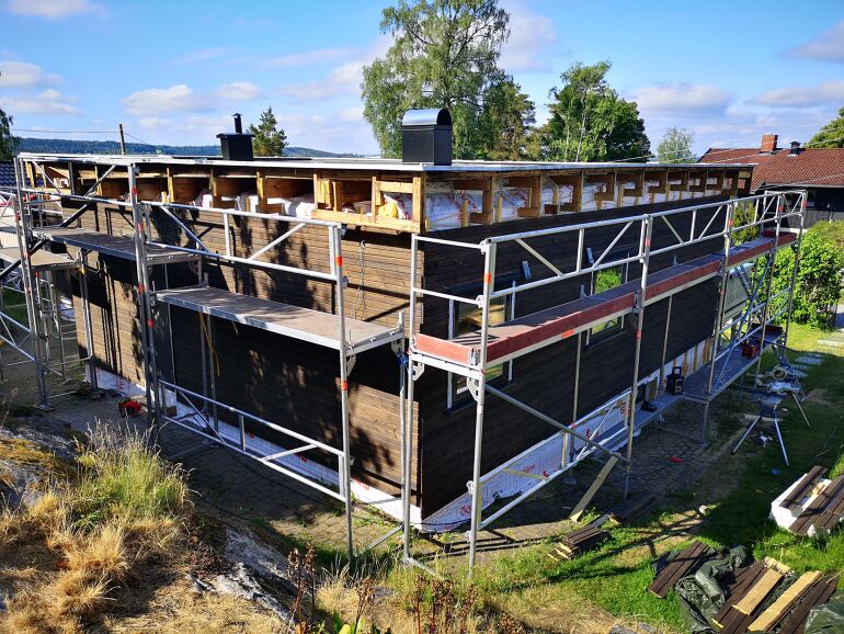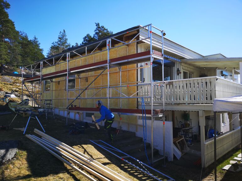 Nå er vi i gang med etterisolering av fasade på bolig på Oppegård.
